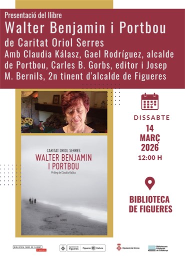 Presentació del llibre Walter Benjamin i Portbou, de Caritat Oriol Serres, a càrrec de l'autora en conversa amb Claudia Kálasz. Intervindran Gael Rodríguez, alcalde de Portbou, Carles B. Gorbs, editor i Josep M. Bernils, 2n tinent d'alcalde de Figueres.