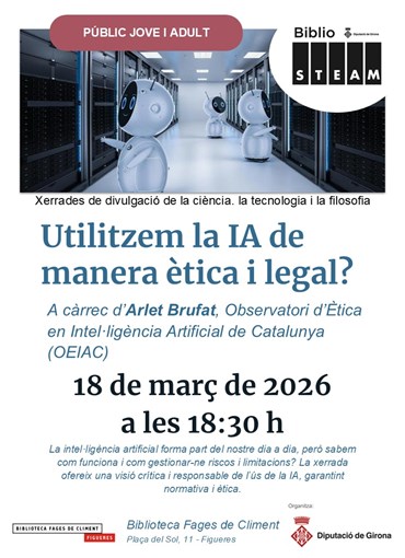 BiblioSTEAM. Utilitzem la IA de manera ètica i legal?», a càrrec d’Arlet Brufat - Observatori d’Ètica en Intel.ligència Artificial de Catalunya (OEIAC)